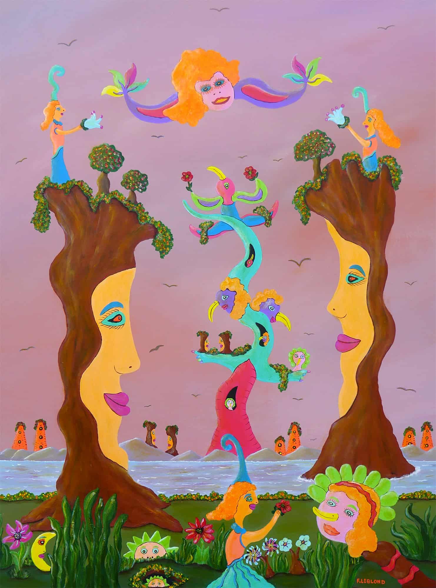 Le regard du spectateur se perd dans cette symphonie chromatique où les formes s’entrelacent et s’hybrident. Françoise Leblond convoque un bestiaire fantastique et une humanité fusionnelle, où chaque élément semble dialoguer avec l’autre. Les visages-arbres, totems de sagesse, échangent en silence tandis que de graciles créatures ailées orchestrent un ballet aérien.