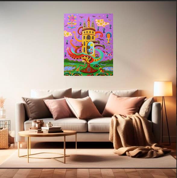 Au cœur de la composition, une tour organique s’élève, à la fois ancrée dans la terre et ouverte vers le ciel, comme un axe de circulation entre les réalités.